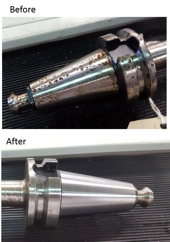 After: Same tool holder after 2 minutes in the RoWi III shank cleaner... ready to be assembled and preset before heading out to the machine.
